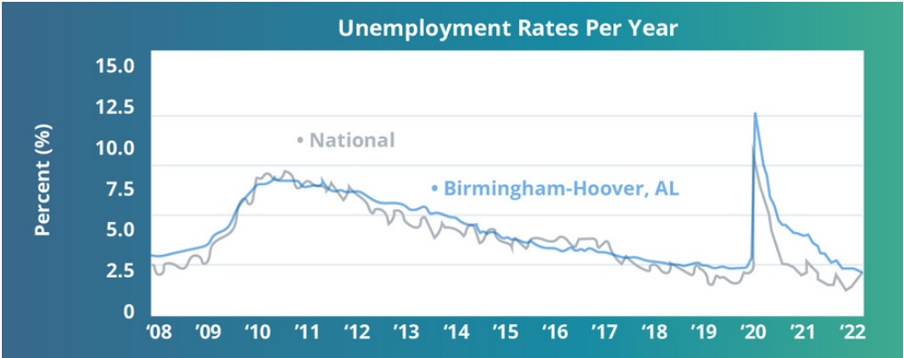 According to the U.S. Bureau of Labor Statistics (BLS), Birmingham’s unemployment rate decreased from 4.0% in June 2021 to 3.0% in June 2022. That’s a full 0.6 percentage points lower than the national unemployment rate. The Birmingham metro is home to three Fortune 1000 companies, including Regions Financial Corporation, Encompass Health, and Vulcan Metals Company. The Magic City’s strong employment figures have earned it acclaim from Forbes as a top 10 promising job market.